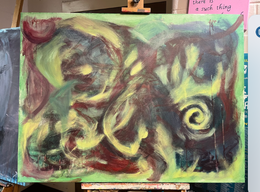 The photos below represent my progress with my abstract painting, with the first image being where I started and the last being where I am currently. At first I started with a basic color background, still using methods of scumbling and painting with my whole arm. In the second picture, I started to add other colors and create a form of movement through lines and other methods. In the third picture (or my current progress) I added in a lighter color (yellow) to balance out the dark that was over the majority of my painting. I also started to fill in some blanks with much needed shapes to get rid of just utilizing lines, which made my painting much more interesting. I also started to fill up the canvas a little more, covering a bit more of the edges to really define the work.