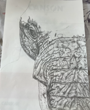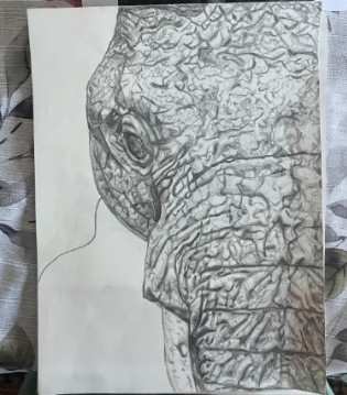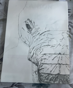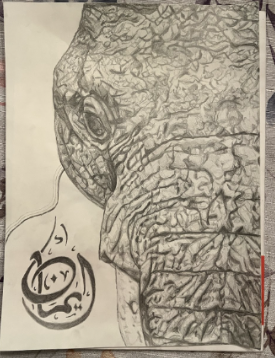 For my "head" theme project I also continued my previous theme of faith, as it deeply resonates with me. I decided to take inspiration from my play pages and use graphite to draw half the face of a realistic elephant. The elephant in itself is a faithful creature (as well as my favorite animal) that also represents strength. In the corner of the drawing I drew arabic calligraphy of my name in arabic because Eman means faith. Overall the process was fun but lengthy, as all the wrinkles in the skin were pre-planned and then shaded. Below are the process pictures of my "head" theme project.